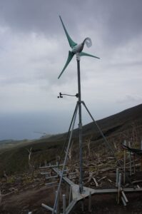 2000年に噴火した雄山における火山ガスの放出は現在も続いており、火口付近では立入禁止区域となっています。三宅村は、火山ガスの計測のため、電源が必要となり、2015年3月、標高約700mの山頂火口付近に風力・太陽光ハイブリッドシステムを1基設置し、その後2016年3月、標高約500m地点にも同システムを設置いたしました。